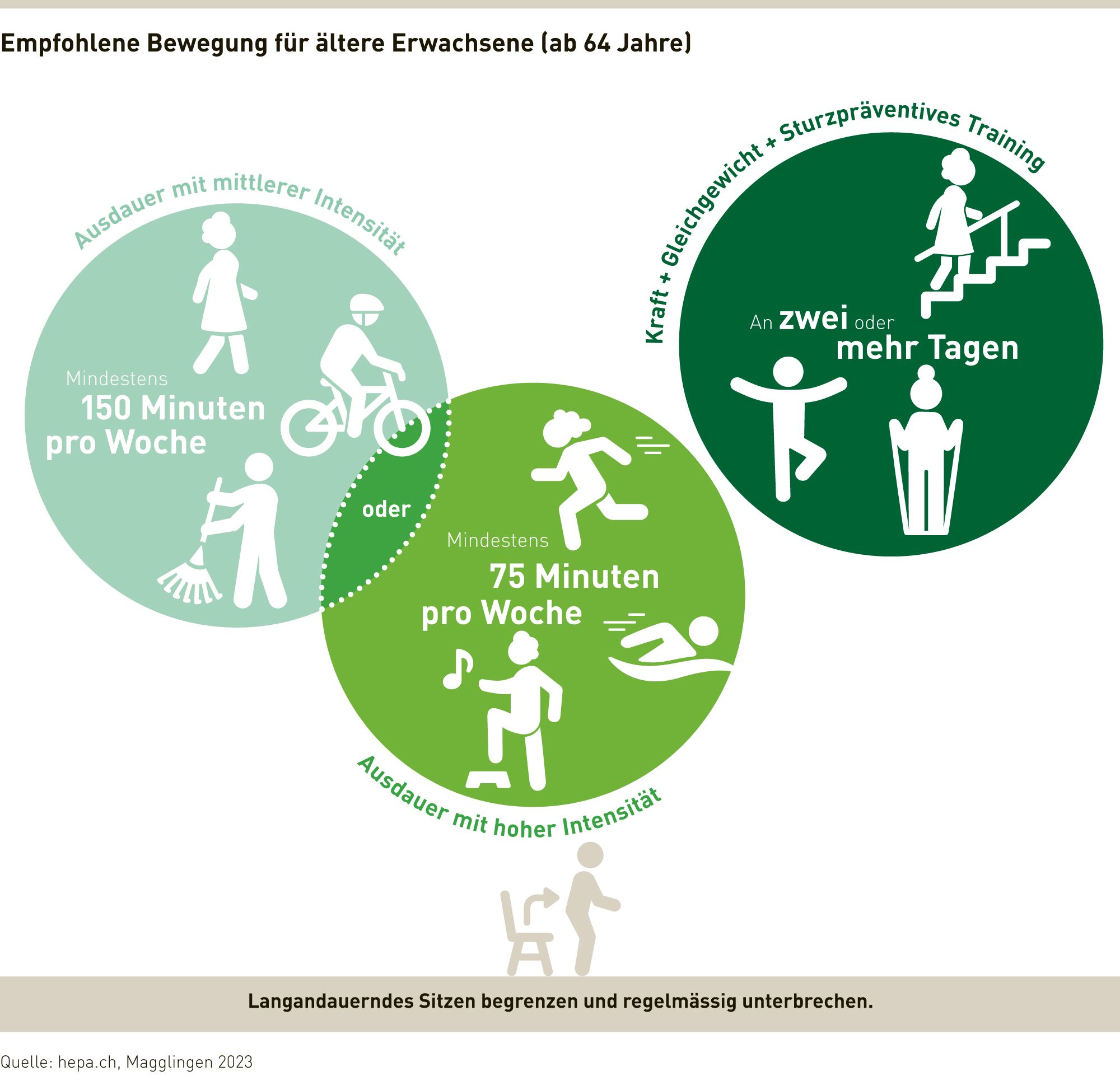 Die grösste positive Gesundheitswirkung haben mindestens 150 bis 300 Minuten ausdauerorientierter Bewegung mit mittlerer Intensität (z.B. Velofahren, Garten- und Hausarbeit etc.) oder mindestens 75 bis 150 Minuten mit hoher Intensität (z.B. Schwimmen, Skilanglaufen und Herz-Kreislauf-Training) wöchentlich. Dabei kann Bewegung mit mittlerer und hoher Intensität auch kombiniert werden. Bewegung über 300 Minuten respektive 150 Minuten bringt immer noch einen zusätzlichen Nutzen für die Gesundheit, auch wenn dieser nicht mehr so gross ist.