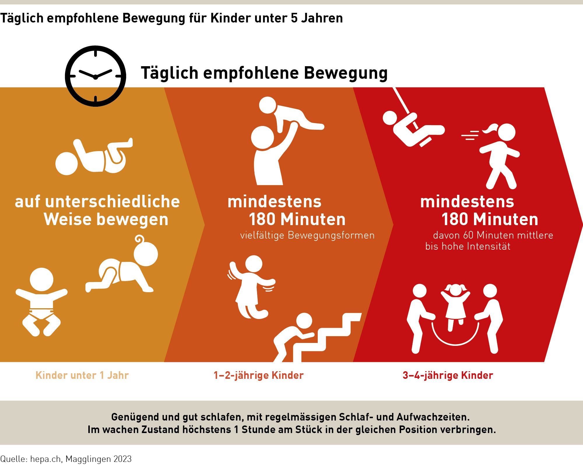 - drei bis fünfjährige Kinder: mind 180 Bewegungsminuten täglich, davon 60 bei mittlerer oder hoher Intensität