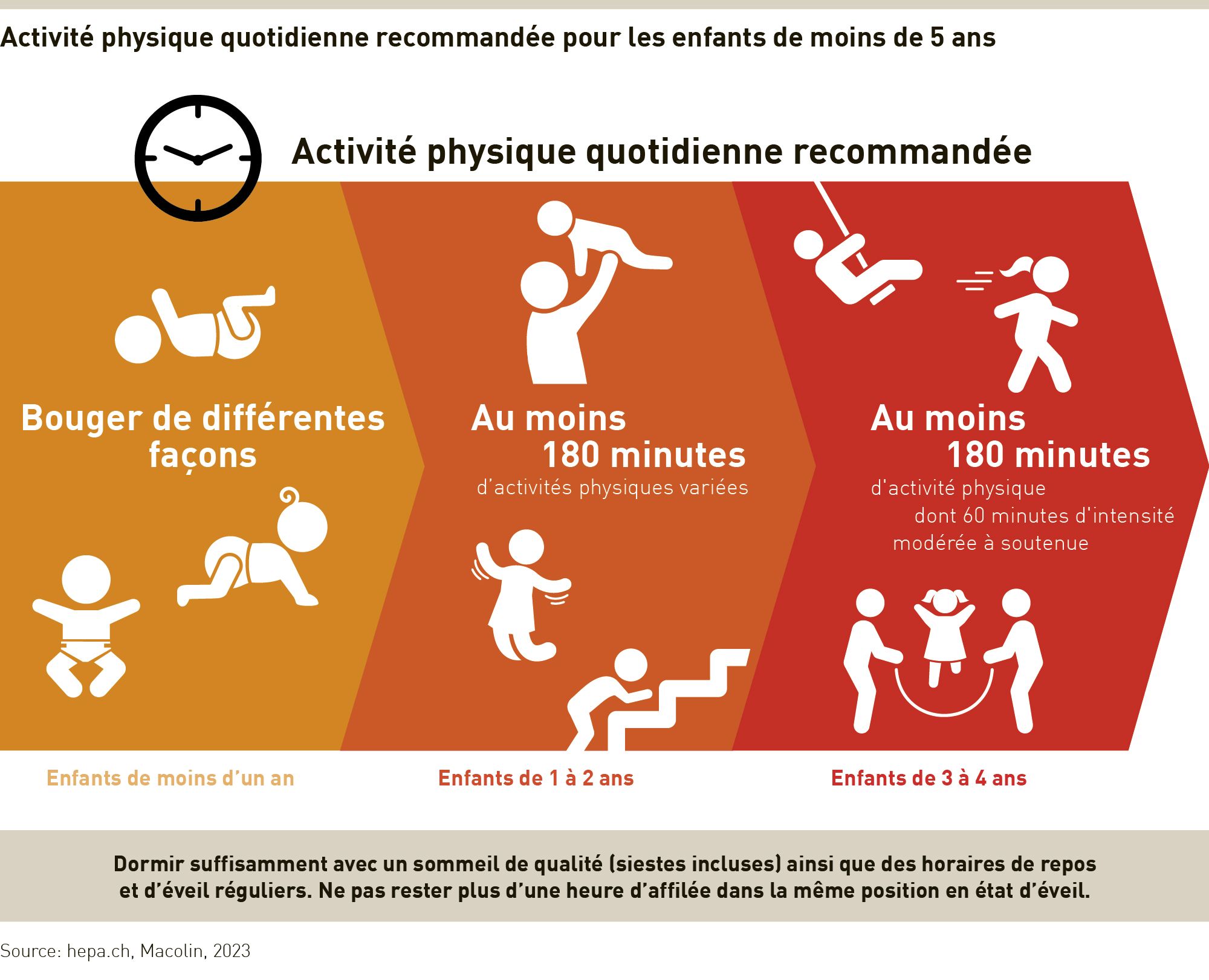 - Enfants de 1 à 2 ans: au moins 180 minutes d'activité physique chaque jour.