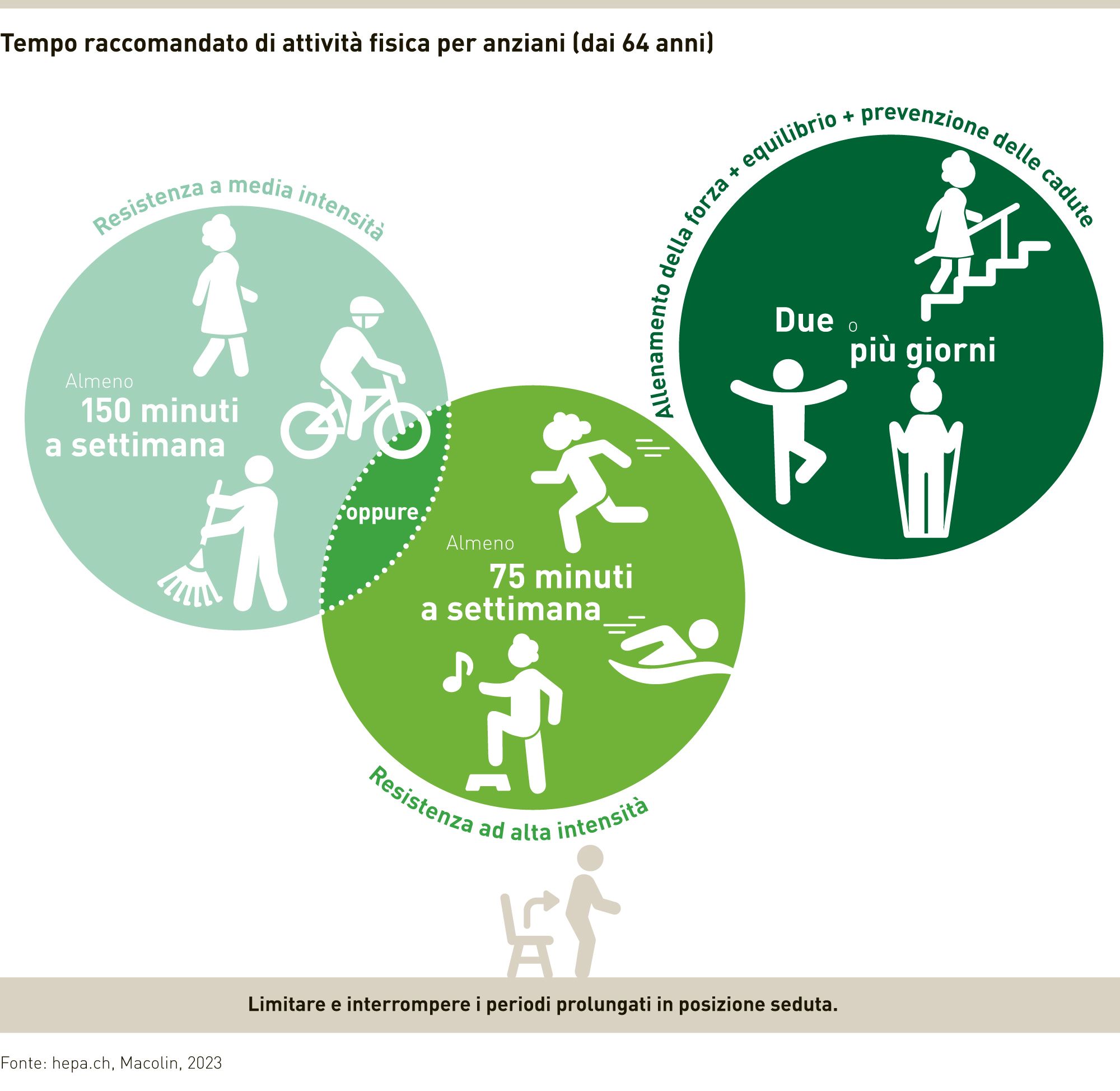 È consentita la riproduzione degli elementi grafici presenti nei documenti di base. Si rimanda a «Fonte: hepa.ch, Macolin 2023». Per le pubblicazioni relative alle raccomandazioni sull'attività fisica, si prega di contattare hepa e di inviare a hepa il buono stampa e un esemplare giustificativo.